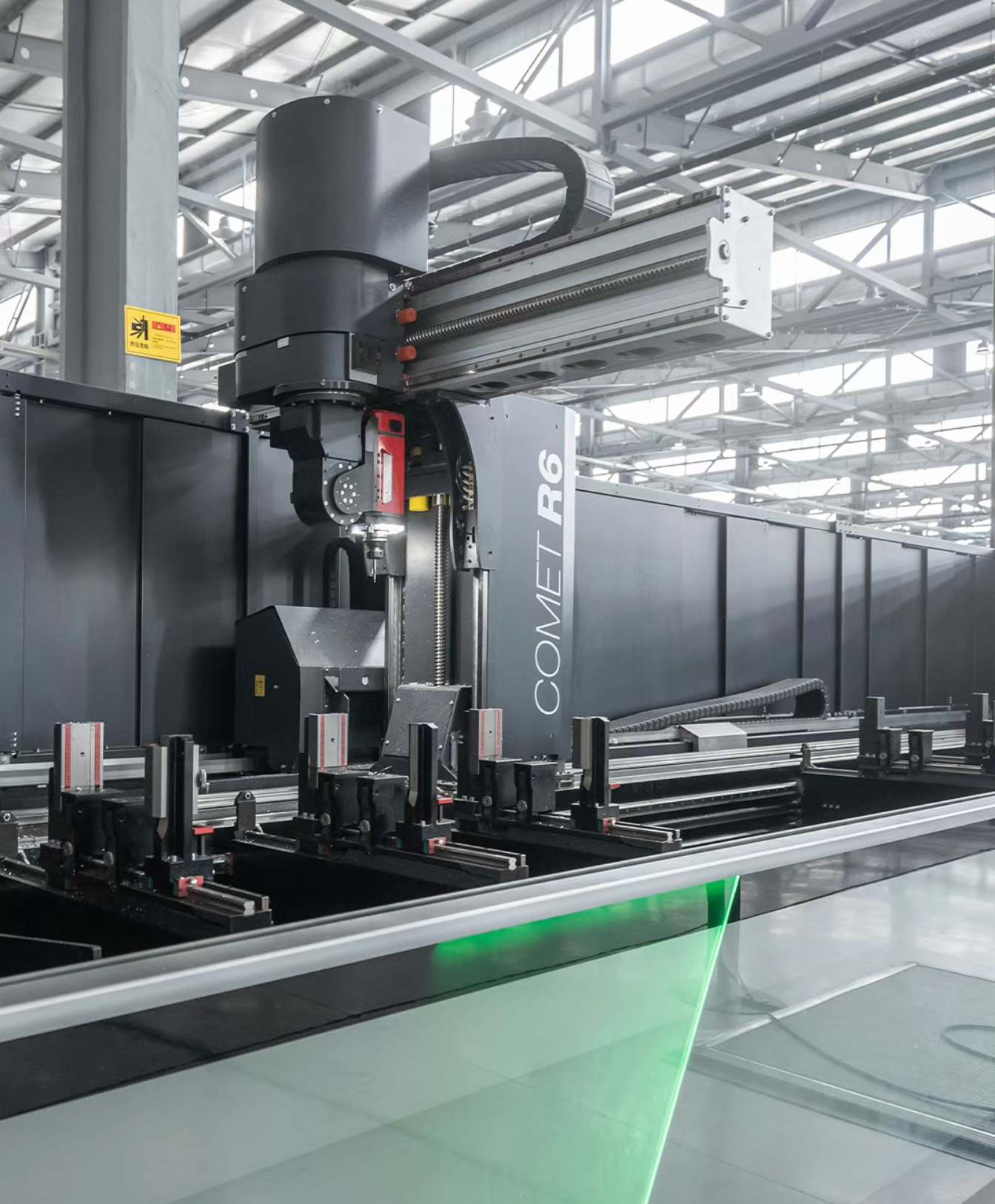 The 12-axis Emmegi at Xintury Huzhou Base is equipped with an electric axis on the CNC module, which can process the full contour of workpieces/materials and continuously and automatically process profiles of 7,500mm in large quantities, so as to meet the mass production of special-shaped products for the project.